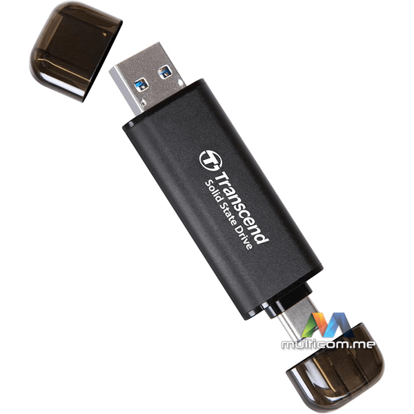 Trascend ESD310 512GB Black prenosivi SSD disk │ Brzina prenosa do 10 Gbps │ Dva konektora: USB Type-A i Type-C │ Kompatibilnost sa Windows, macOS i Android │ Brzine čitanja/pisanja do 1050/900 MB/s │ 256-bitno AES šifriranje za sigurnost