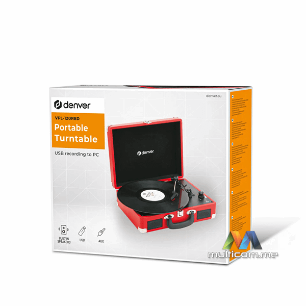 DENVER VPL-120 Red gramofon │ Retro dizajn │ Višestruke brzine reprodukcije │ Prijenosni dizajn kofera │ Ugrađeni zvučnici │ Phono izlaz │ Auto-stop ručica