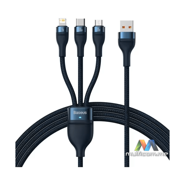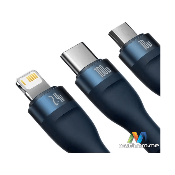 Baseus Flash 3-in-1 100W 1.2m Blue kabl │ USB-C, Lightning, Micro USB konektori │ Brz prenos podataka do 480 Mbps │ Dužina kabla 1.2m │ Snaga punjenja do 100W │ Svjetlosni indikator za status punjenja