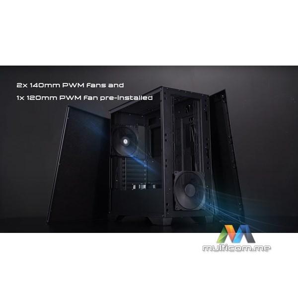 Kućište ima dodatni sloj materijala za apsorpciju zvuka na bočnim i prednjim panelima, što obezbjeđuje tiho korisničko iskustvo. APEX Q dolazi sa tri unaprijed instalirana PWM ventilatora — jednim 140mm na prednjoj strani, jednim 140mm pozadi i jednim 120mm na poklopcu napajanja — čime se optimizuju performanse hlađenja i protok vazduha, posebno za grafičku kartu.