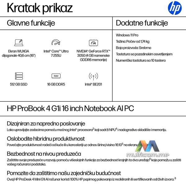 HP ProBook 4 G1i AI A23R4EA laptop │ Windows 11 Pro │ Intel Ultra 7 255U │ 512GB NVMe SSD │ 16GB DDR5-5600 │ IntelGraphics │ 16-inch WUXGA ekran │ Backlit YU tastatura