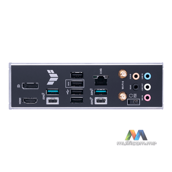 | Zadnji Panel I/O Portovi | 1 x USB 3.2 Gen 2x2 port(ovi) (1 x USB Type-C®) 3 x USB 3.2 Gen 2 port(ovi) (2 x Type-A + 1 x USB Type-C®) 4 x USB 2.0 port(ovi) (4 x Type-A) 1 x DisplayPort 1 x HDMI® port 1 x Wi-Fi Modul 1 x Realtek 2.5Gb Ethernet port 5 x Audio priključaka 1 x BIOS FlashBack™ dugme |