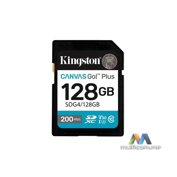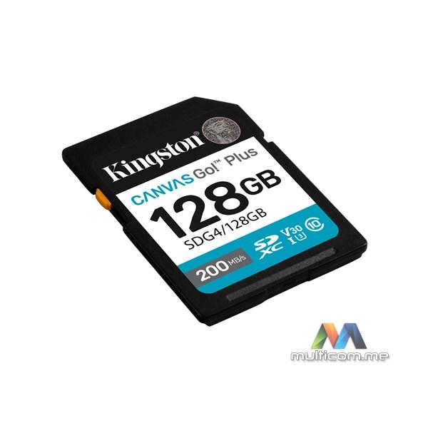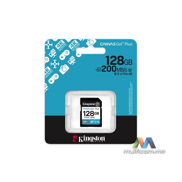 Kingston Canvas Go! Plus 128GB SD kartica (SDG4/128GB) │ Kapacitet 128 GB │ SDXC tip kartice │ Brzina čitanja 200 MB/s │ Brzina pisanja 100 MB/s │ UHS klasa brzine U3 │ Video-brzina V30 │ Klasa 10 memorije
