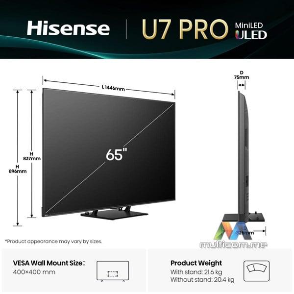 Hisense 65U7Q PRO ULED MiniLED 4K smart TV pametni televizor │ Mini-LED Pro │ Hi-View AI Engine │ 165Hz Game Mode Ultra │ 2.1.2 višekanalni surround zvuk │ QLED boje sa Pantone validacijom │ Total HDR Solution │ AI 4K Upscaler │ Dolby Vision Atmos │ IMAX Enhanced │ Hands-free glasovna kontrola │ VIDAA Smart TV